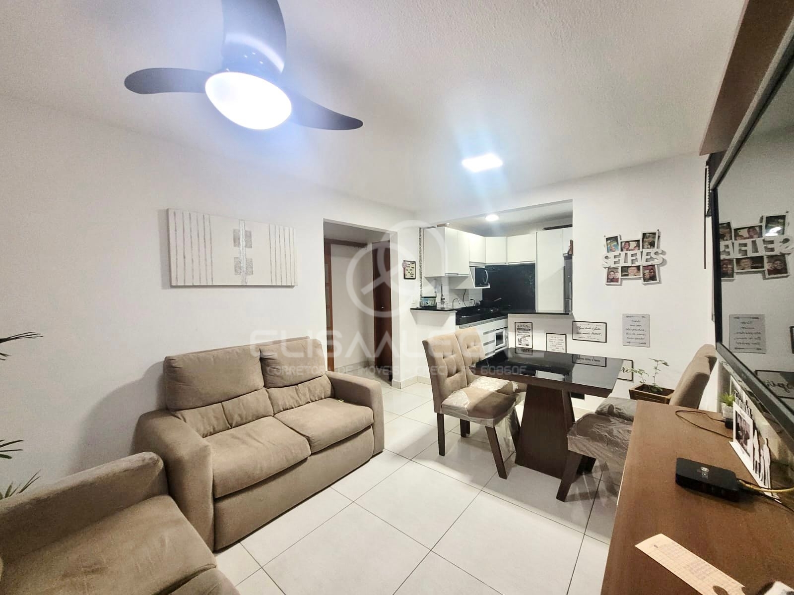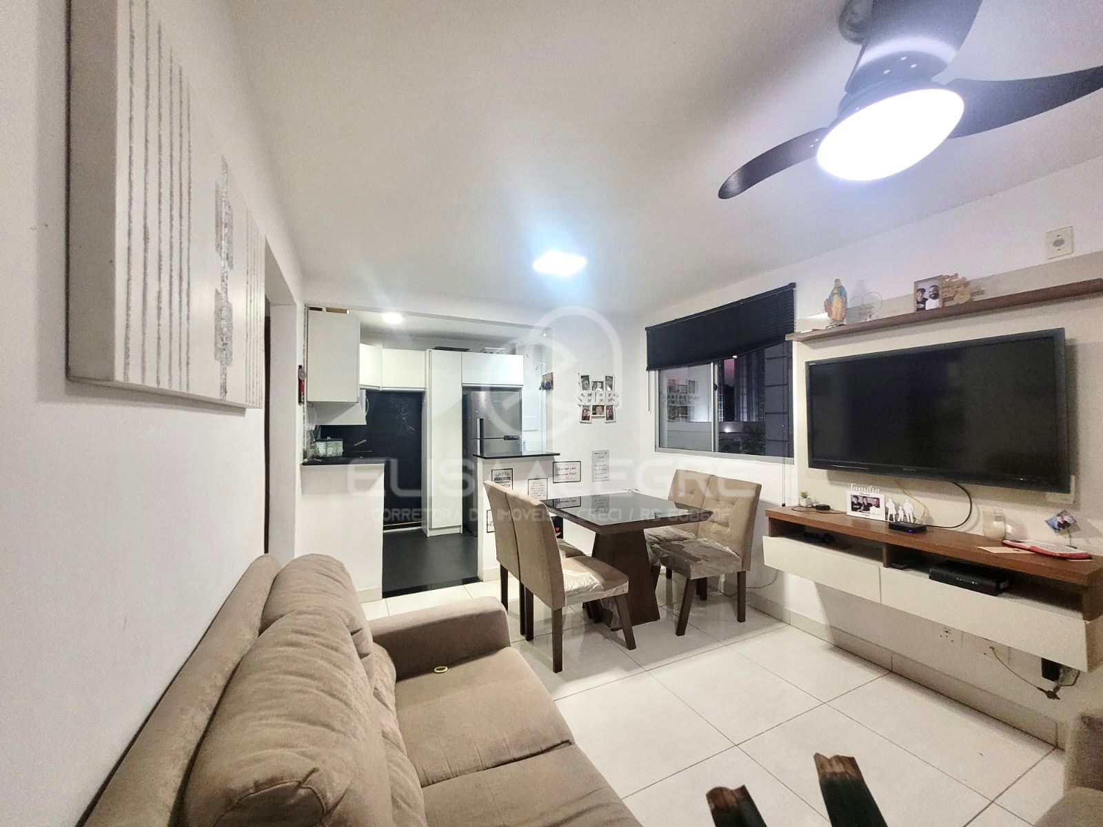 Piso em porcelanato preto na cozinha e banheiro, e porcelanato claro no restante do imóvel. Ar condicionado 12.000 BTUs no quarto de casal e ventilador de teto no quarto de solteiro e na sala de estar.